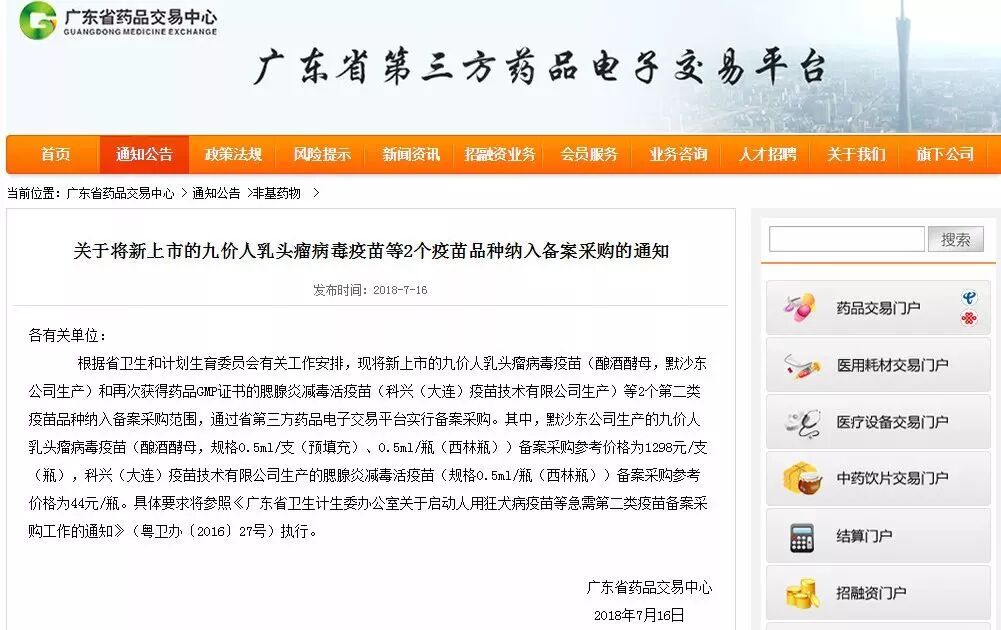 日前,据广东省药品交易中心官网消息,默沙东公司生产的九价人乳头瘤病毒疫苗已经进入备案采购环节,备案采购参考价格为1298元/支(瓶)